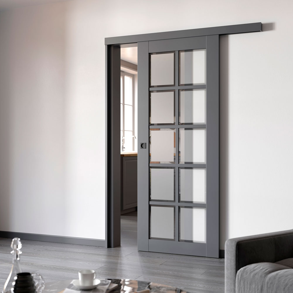 Классический и самый распространённый тип раздвижных дверей. Полотно движется параллельно стене вдоль направляющих, установленных над проёмом. При открывании дверь заезжает на стену, оставаясь видимой. Такие конструкции просты в монтаже и не требуют серьёзной перестройки стен. Подходят для любых помещений — от спален до кухонь. Единственный недостаток — необходимо предусмотреть свободное пространство на стене, равное ширине дверного полотна.
