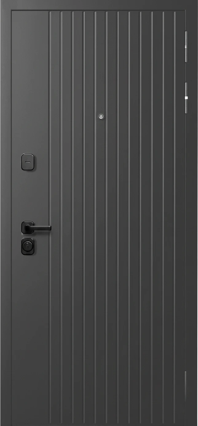 - Снаружи — атмосферостойкое порошковое покрытие «Букле Графит» с фактурой рейки, современный и лаконичный стиль.