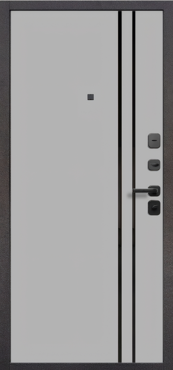Металлический эксцентрик усиливает место установки замков. Глазок расположен сбоку — можно видеть площадку под углом, что удобнее центрального расположения. Раздельная чёрная ручка и накладки дополняют общую композицию.
