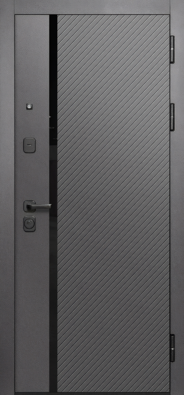 Графитовая поверхность скрывает мелкие загрязнения и потёртости — практично для подъезда, где дверь контактирует с сумками, ключами, детскими колясками. Входная дверь Олимпия не требует частого ухода: достаточно протереть влажной тряпкой раз в месяц.