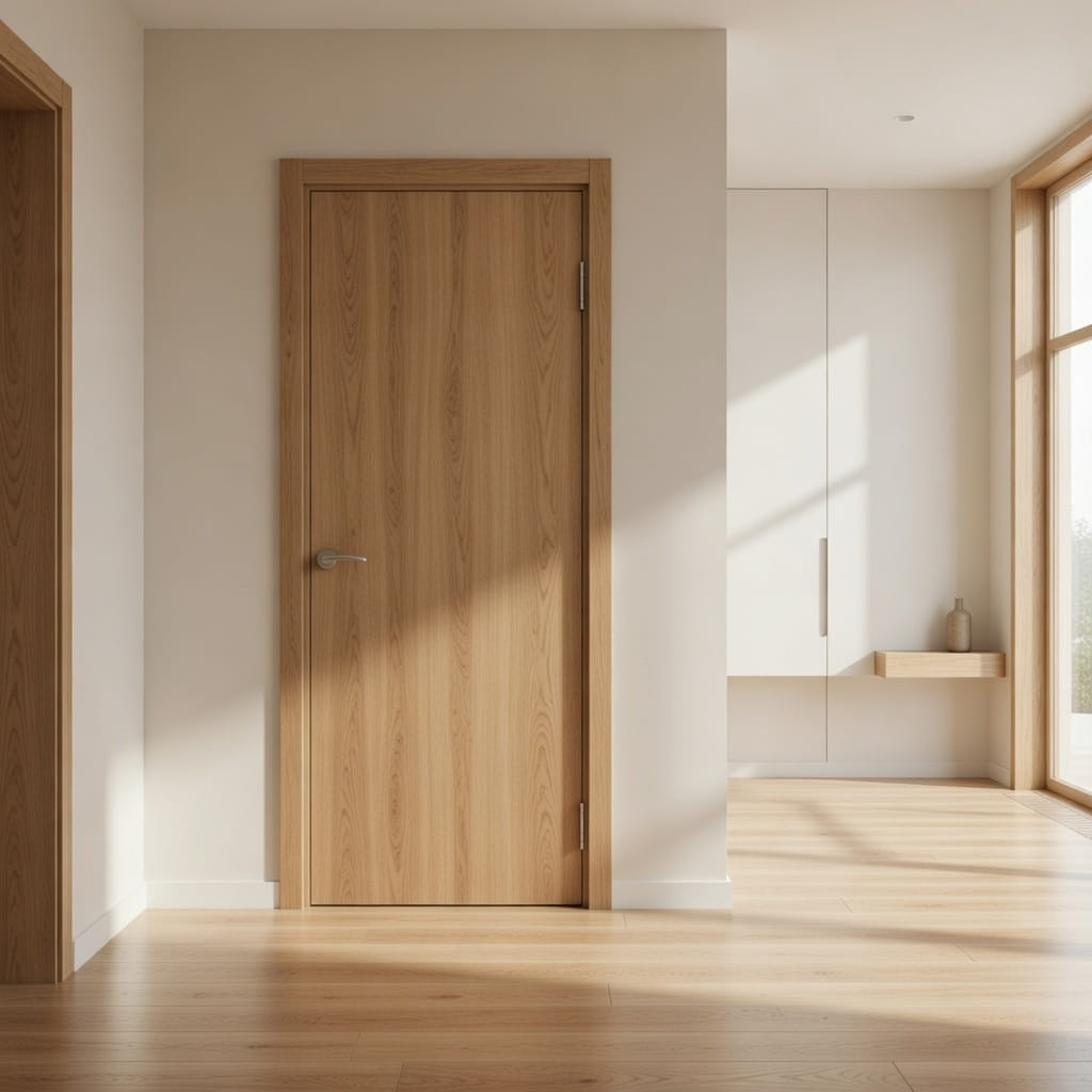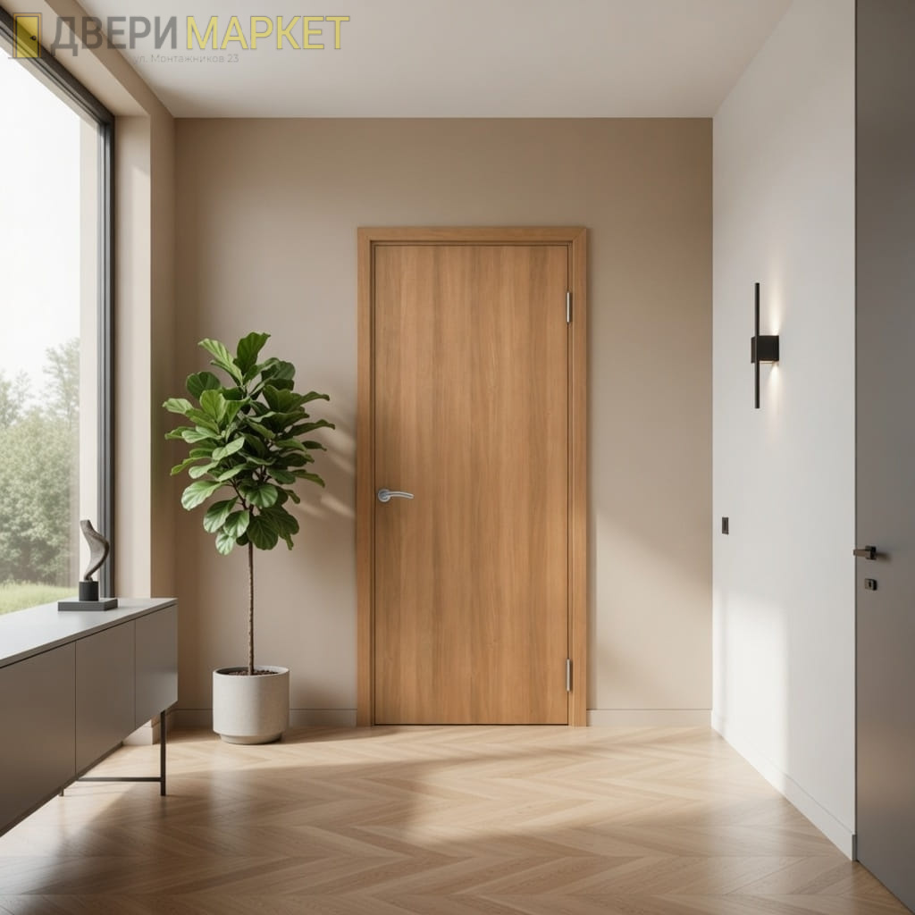 Дверь имеет гладкую поверхность цвета «песочный дуб», которая прекрасно впишется в любой интерьер. Она также является влагостойкой, что делает её идеальным выбором для ванной комнаты или кухни.
