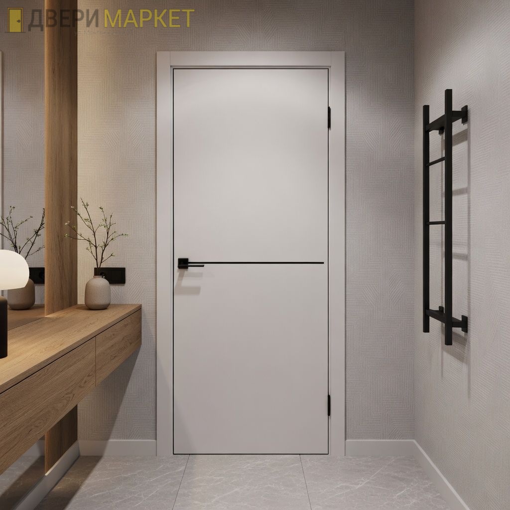 В наличии все востребованные размеры: 2000×600, 2000×700, 2000×800 и 2000×900 мм для комплектации всего объекта дверями в едином дизайне. Светлый декор делает интерьер воздушным, а чёрные детали добавляют графичности и характера.