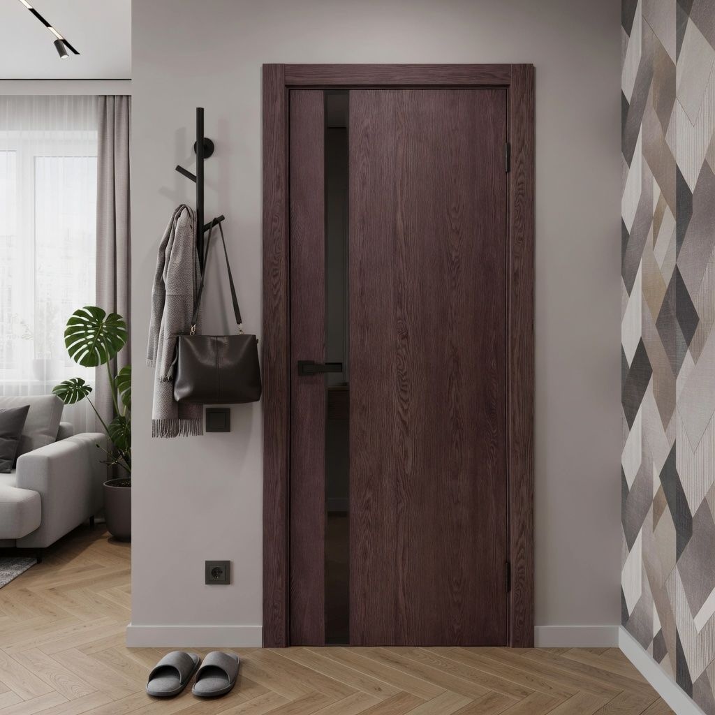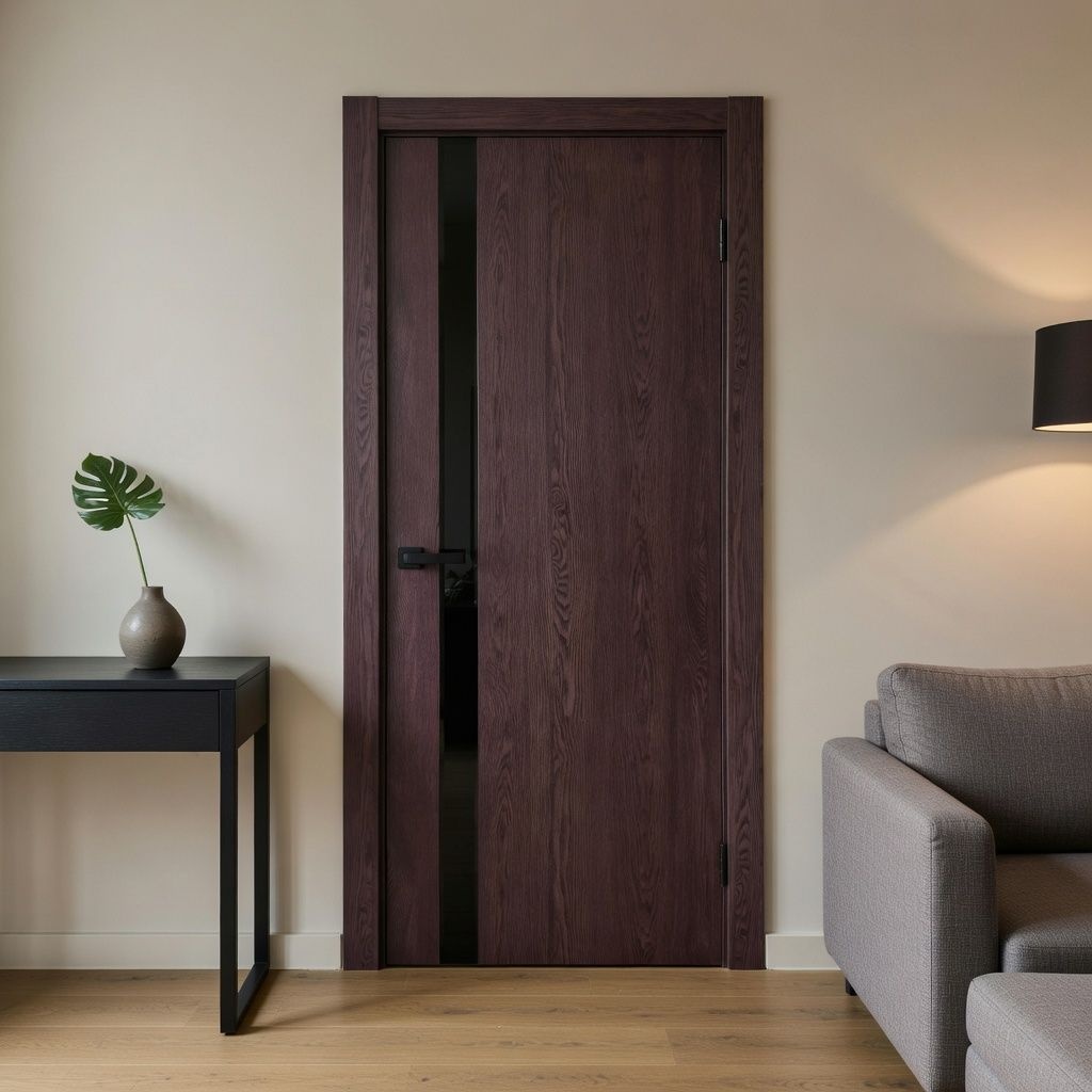 В наличии все востребованные размеры: 2000×600, 2000×700, 2000×800 и 2000×900 мм для оформления всего объекта в едином стиле. Темная дверь создаёт выразительный контраст в светлом интерьере и добавляет характера в пространство.
