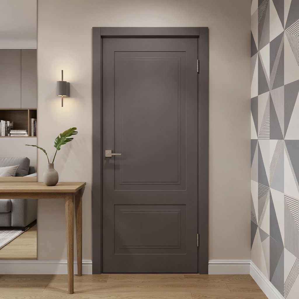 Геометрическая фрезеровка с чёткими вертикальными линиями создаёт игру света и тени на поверхности полотна, визуально увеличивая высоту потолков. Тёмный цвет эффектно контрастирует со светлыми стенами и отлично комбинируется с металлической фурнитурой.