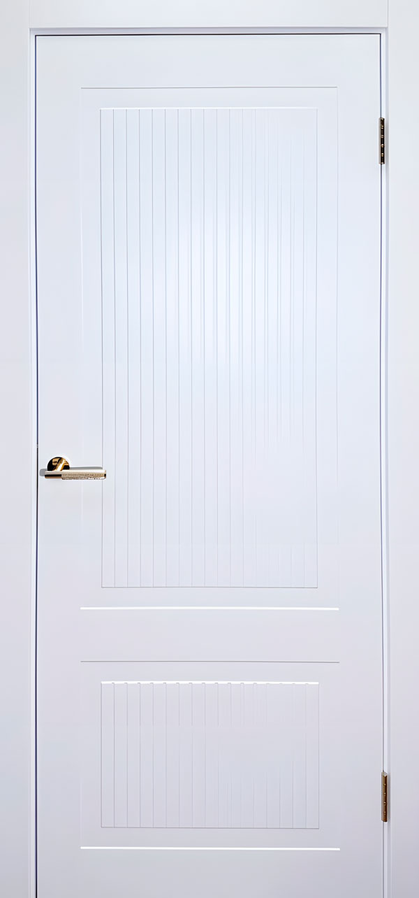Выразительная фрезеровка с геометрическими вертикальными панелями добавляет полотну объём и современный дизайн. Белый цвет универсален: он сочетается с любым напольным покрытием, мебелью и декором, делая интерьер лёгким и воздушным.