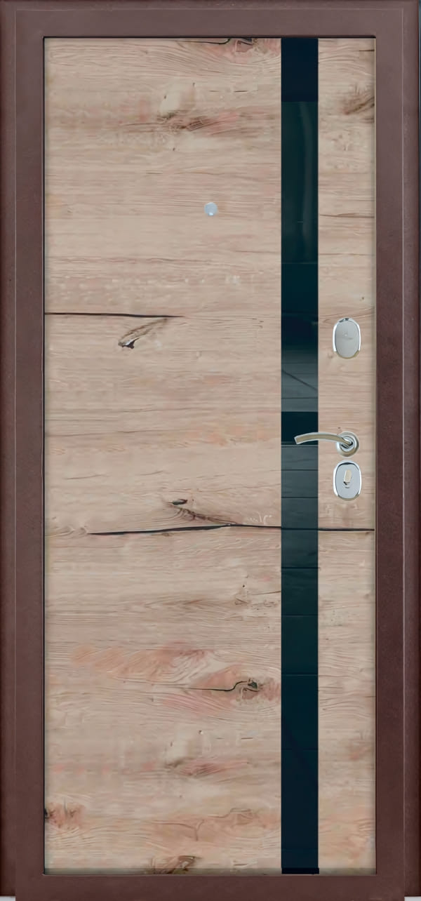Стильная входная дверь с эффектной вставкой из черного стекла, которая сочетает современный дизайн с надежной защитой. Идеальное решение для тех, кто ценит эстетику и безопасность.