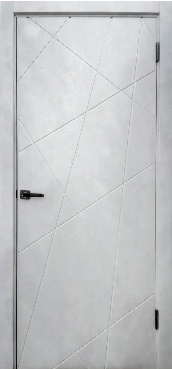 Межкомнатная дверь Вектор 4 Бетон снежный — современная глухая модель в светлом индустриальном декоре с выразительной геометрической фрезеровкой по полотну. Идеально подходит для интерьеров в стиле лофт, минимализм, хай-тек и современная урбанистика.
