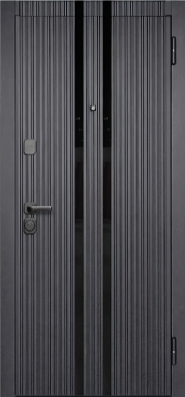 Фрезерованная МДФ-панель 10 мм в цвете «чёрный эксимер» с глянцевыми вставками лакобель — это игра текстур, которая делает дверь визуально интереснее. Глубокий чёрный с металлическим отливом смотрится солидно на любой площадке. Матовые фрезерованные участки контрастируют с глянцевыми, создавая эффект дорогой отделки.