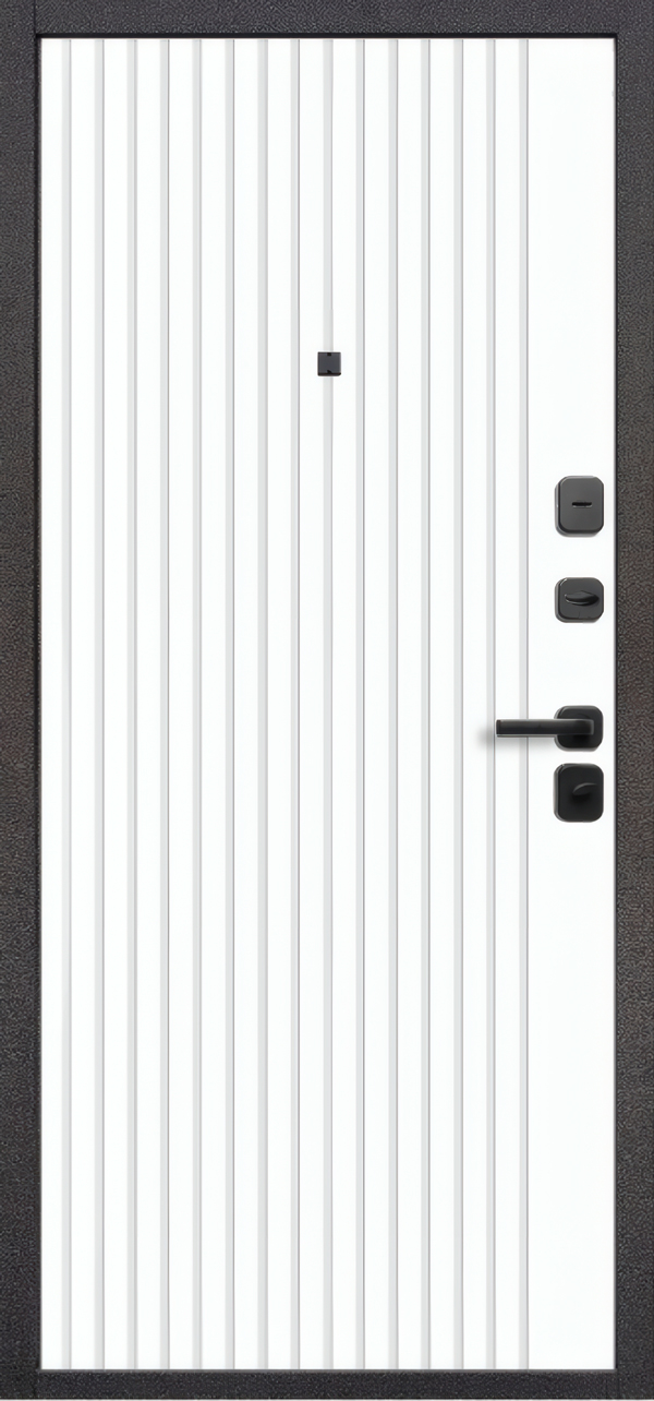 Толщина внутренней панели 10 мм делает её устойчивой к случайным ударам сумками, зонтами, детскими игрушками. Входная дверь в квартиру работает на контрасте: снаружи тёмная презентабельная, внутри светлая и спокойная. Не нужно подбирать цвет под ремонт — белый вписывается всегда.