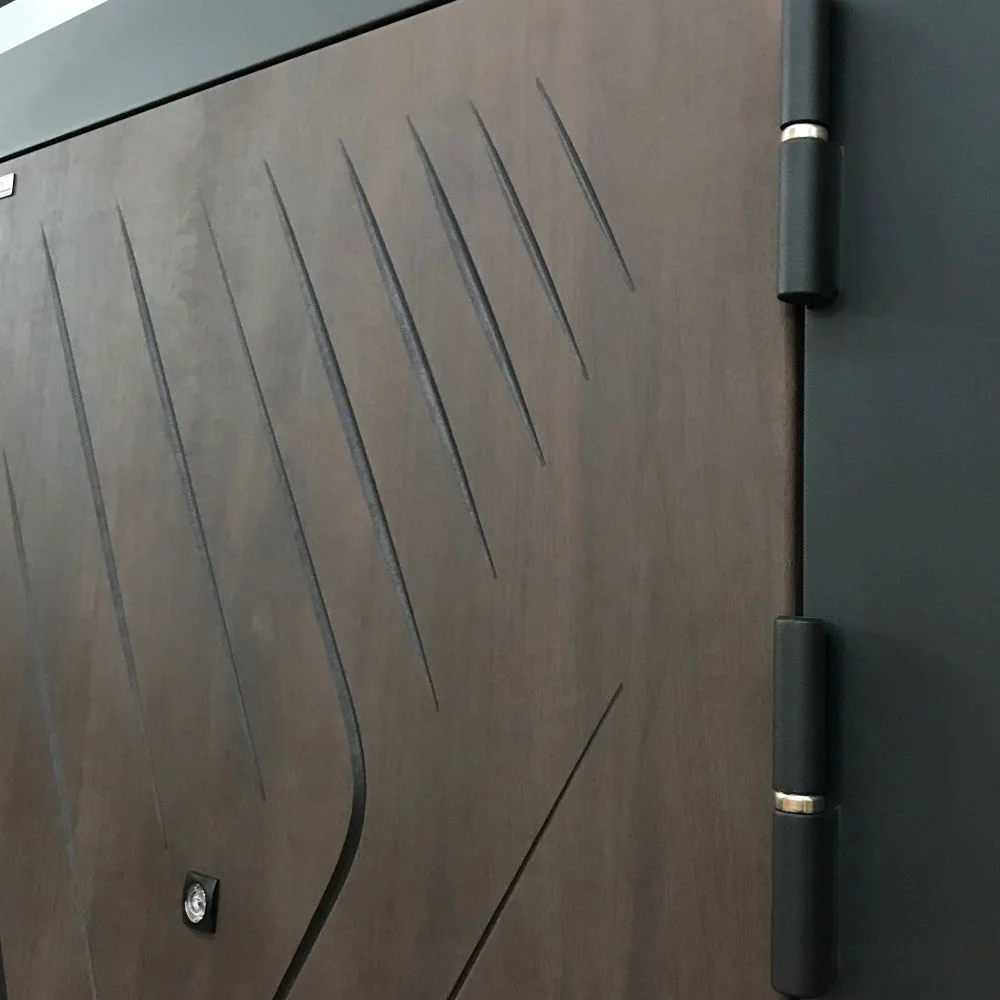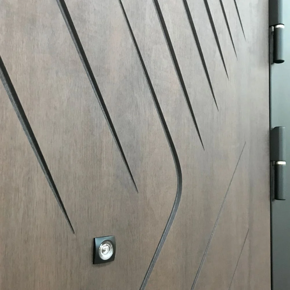 - Благородная фактура: Снаружи сталь защищена износостойким полимерным покрытием в цвете «Муар черный». Внутренняя сторона по умолчанию оформлена в роскошном оттенке «Дуб бодега коричневый» с добавлением черной патины. Этот прием искусственного состаривания придает двери дорогой винтажный вид, который идеально гармонирует со строгой черной фурнитурой.
