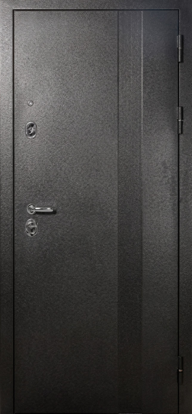 Экстерьер двери выполнен в классическом стиле: металл декорирован штамповкой и покрыт атмосферостойким полимерным слоем в практичном цвете «Антик серебро». Это покрытие отлично скрывает уличную пыль и устойчиво к случайным царапинам.