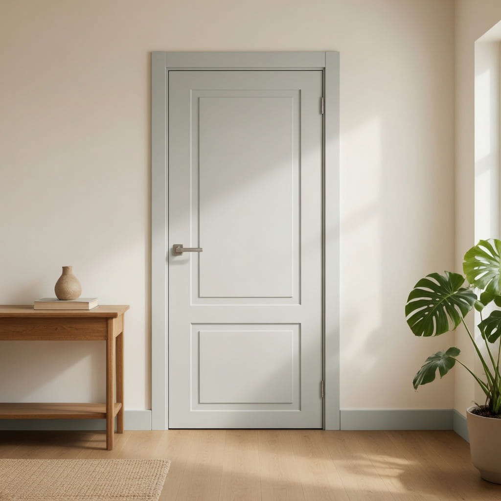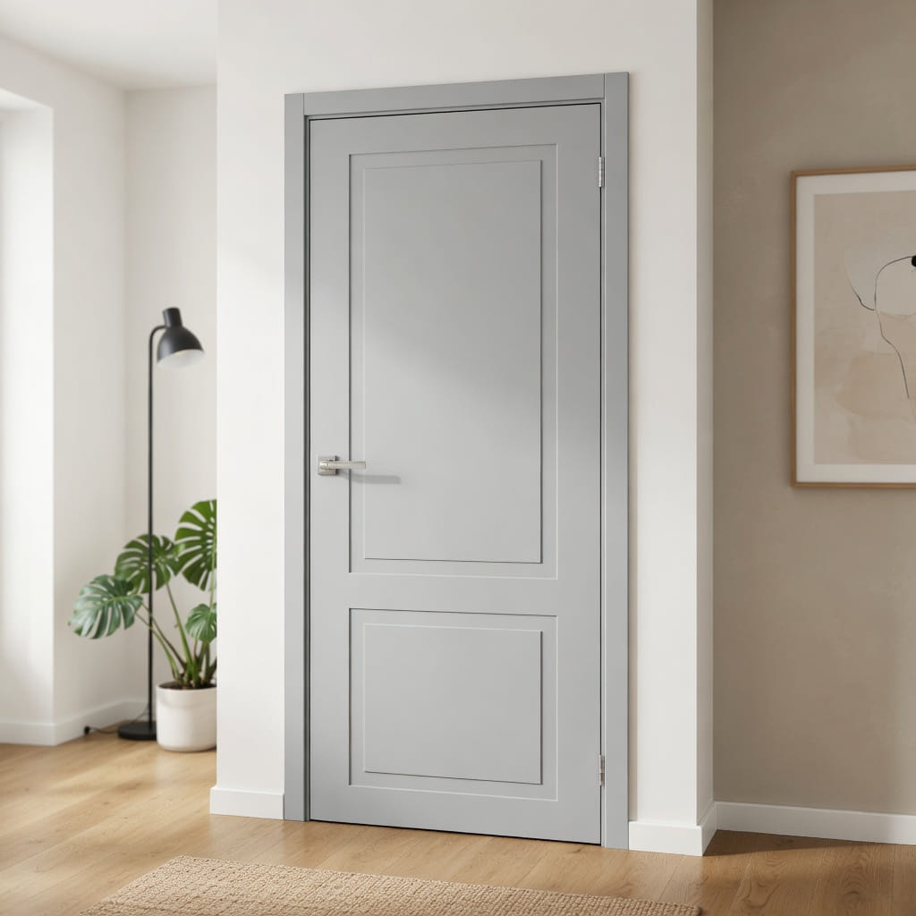 - Отделка: Элегантное светло-серое покрытие с матовой текстурой, придающее двери свежий и современный вид.